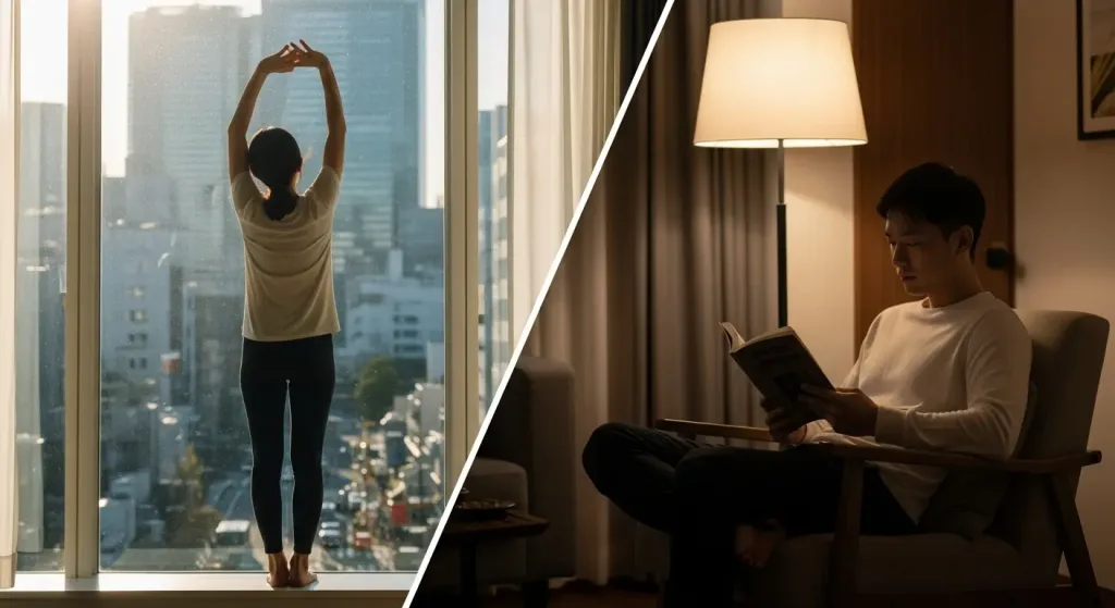 • 夜型でも朝の光を15分浴びる。窓際の朝食、ベランダでの深呼吸でOK。
